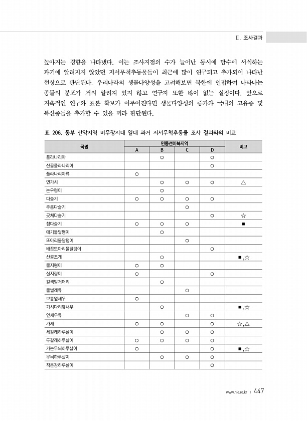 Ⅱ. 조사결과 www.nie.re.kr ? 447 국명 민통선이북지역 비고 A B C D 플라나리아 ○ ○ 산골플라나리아 ○ 플라나리아류 ○ 연가시 ○ ○ ○ △ 논우렁이 ○ 다슬기 ○ ○ ○ ○ 주름다슬기 ○ 곳체다슬기 ○ ☆ 참다슬기 ○ ○ ○ ■ 애기물달팽이 ○ 또아리물달팽이 ○ 배꼽또아리물달팽이 ○ 산골조개 ○ ■,☆ 물지렁이 ○ ○ 실지렁이 ○ ○ 갈색말거머리 ○ 물벌레류 ○ 보통옆새우 ○ 가시다리옆새우 ○ ■,☆ 옆새우류 ○ ○ 가재 ○ ○ ○ ☆,△ 세갈래하루살이 ○ ○ ○ 두갈래하루살이 ○ ○ ○ ○ 가는무늬하루살이 ○ ○ ■,☆ 무늬하루살이 ○ ○ ○ 작은강하루살이 ○ 표 206. 동부 산악지역 비무장지대 일대 과거 저서무척추동물 조사 결과와의 비교 높아지는 경향을 나타냈다. 이는 조사지점의...
