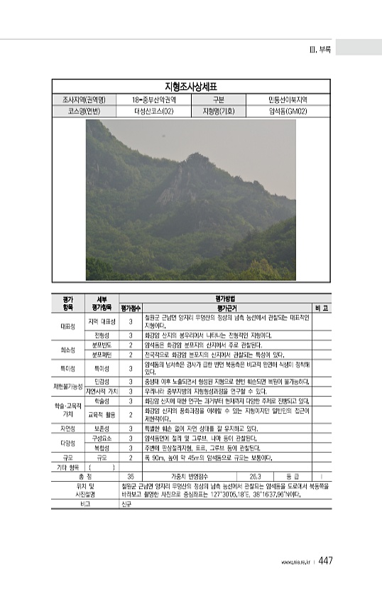 Ⅲ. 부록 www.nie.re.kr ? 447 지형조사상세표 조사지역 권역명 18-중부산악권역 구분 민통선이북지역 코스명 연번 대성산코스 02 지형명 기호 암석돔 GM02 평가 항목 세부 평가항목 평가방법 평가점수 평가근거 비 고 대표성 지역 대표성 3 철원군 근남면 양지리 무명산의 정상의 남측 능선에서 관찰되는 대표적인 지형이다. 전형성 3 화강암 산지의 봉우리에서 나타나는 전형적인 지형이다. 희소성 분포빈도 2 암석돔은 화강암 분포지의 산지에서 주로 관찰된다. 분포패턴 2 전국적으로 화강암 분포지의 산지에서 관찰되는 특성이 있다. 특이성 특이성 3 암석돔의 남서측은 경사가 급한 반면 북동측은 비교적 완만해 식생이 정착해 있다. 재현불가능성 민감성 3 중생대 이후 노출되면서 형성된 지형으로 한번 훼손되면 ...
