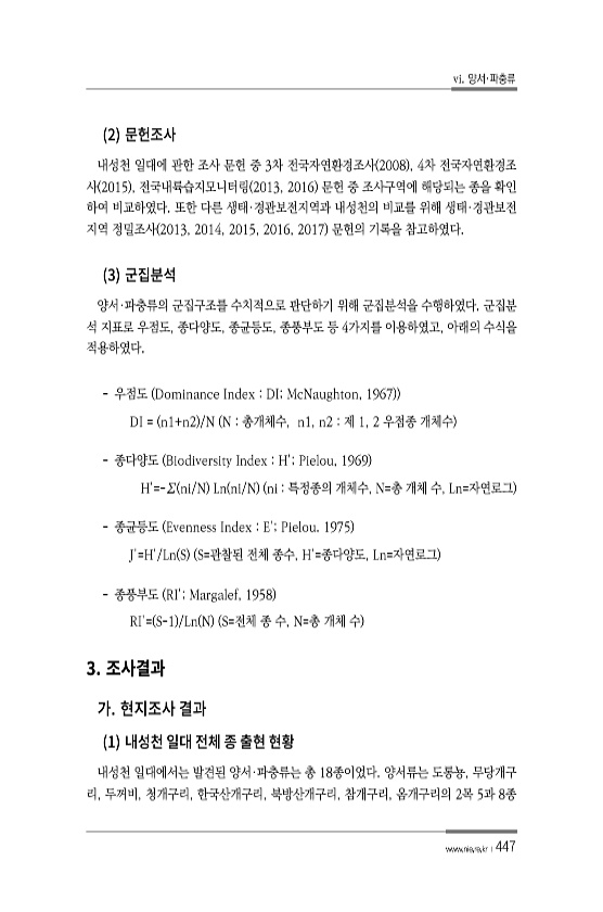 vi. 양서·파충류 www.nie.re.kr ?447 2 내성천 일대에 관한 조사 문헌 중 3차 전국자연환경조사 2008 , 4차 전국자연환경조 사 2015 , 전국내륙습지모니터링 2013, 2016 문헌 중 조사구역에 해당되는 종을 확인 하여 비교하였다. 또한 다른 생태·경관보전지역과 내성천의 비교를 위해 생태·경관보전 지역 정밀조사 2013, 2014, 2015, 2016, 2017 문헌의 기록을 참고하였다. 3 양서·파충류의 군집구조를 수치적으로 판단하기 위해 군집분석을 수행하였다. 군집분 석 지표로 우점도, 종다양도, 종균등도, 종풍부도 등 4가지를 이용하였고, 아래의 수식을 적용하였다. 우점도 Dominance Index DI; McNaughton, 1967 DI = n1+n2 /N N 총개체수, ...