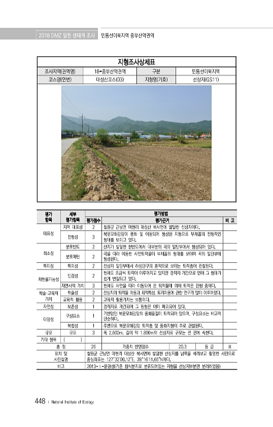 2018 DMZ 일원 생태계 조사 민통선이북지역 중부산악권역 448 ? National Institute of Ecology 지형조사상세표 조사지역 권역명 18-중부산악권역 구분 민통선이북지역 코스명 연번 대성산코스 03 지형명 기호 선상지 GS11 평가 항목 세부 평가항목 평가방법 평가점수 평가근거 비 고 대표성 지역 대표성 2 철원군 근남면 마현리 대성산 북사면에 발달한 선상지이다. 전형성 3 북운모화강암이 풍화 및 이동되어 형성된 지형으로 부채꼴의 전형적인 형태를 보이고 있다. 희소성 분포빈도 2 산지가 발달한 한반도에서 대부분의 곡의 말단부에서 형성되어 있다. 분포패턴 2 곡을 따라 이동한 사면퇴적물이 부채꼴의 형태를 보이며 곡의 말단부에 형성된다. 특이성 특이성 2 선상지 말단부에서 하성단구의 흔적...