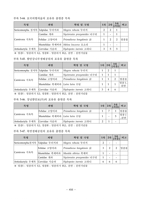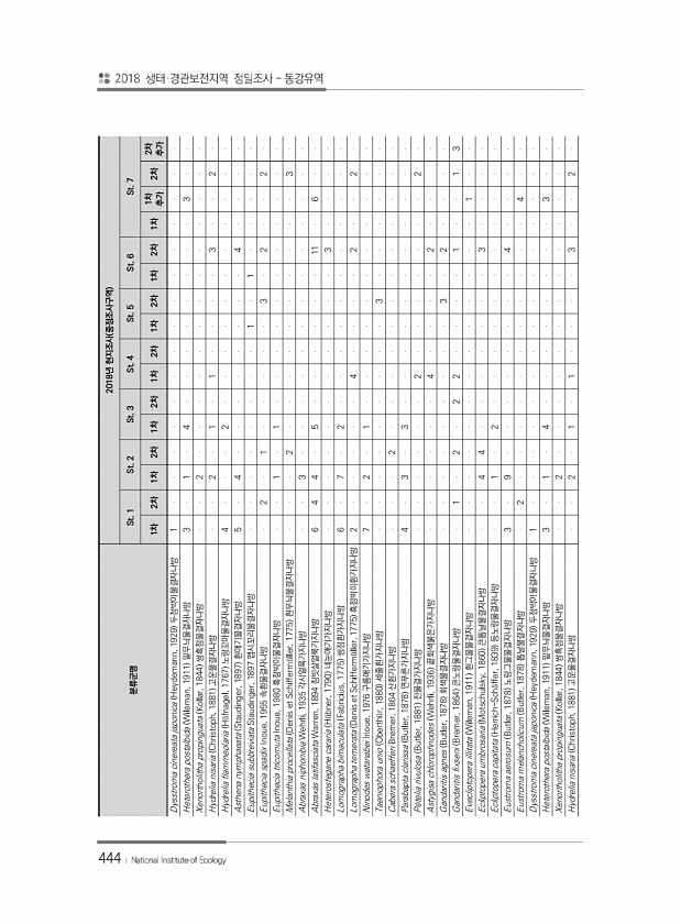 444 분류군명 2018년 현지조사 중점조사구역 St. 1 St. 2 St. 3 St. 4 St. 5 St. 6 St. 7 1차 2차 1차 2차 1차 2차 1차 2차 1차 2차 1차 2차 1차 1차 추가 2차 추가 2차 Dysstroma cinereata japonica Heydemann, 1929 두점박이물결자나방 1 Heterothera postalbida Wileman, 1911 밑무늬물결자나방 3 1 4 3 Xenortholitha propinguata Kollar, 1844 쌍흑점물결자나방 2 Hydrelia nisaria Christoph, 1881...