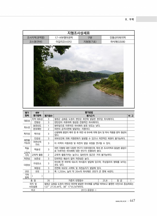 Ⅲ. 부록 www.nie.re.kr ? 447 지형조사상세표 조사지역 권역명 17-서부평야권역 구분 민통선이북지역 코스명 연번 이길리코스 05 지형명 기호 하식애 GS08 평가 항목 세부 평가항목 평가방법 평가점수 평가근거 비 고 대표성 지역 대표성 3 철원군 김화읍 도창리 한탄강 좌안에 발달한 현무암 하식애이다. 전형성 3 한탄강이 곡류하며 형성된 전형적인 하식애이다. 희소성 분포빈도 1 현무암으로 이루어진 하식애의 분포 빈도는 낮다. 분포패턴 2 하천의 공격사면에 발달하는 지형이다. 특이성 특이성 3 신생대에 용암이 매곡 된 후 하천 내 유수에 의해 침식 및 마식 작용을 받아 형성되 었다. 재현불 가능성 민감성 3 외부요인에 의해 지형변화가 발생할 수 있으나 자연적인 복원이 불가능하다. 자연사적 가치 3...