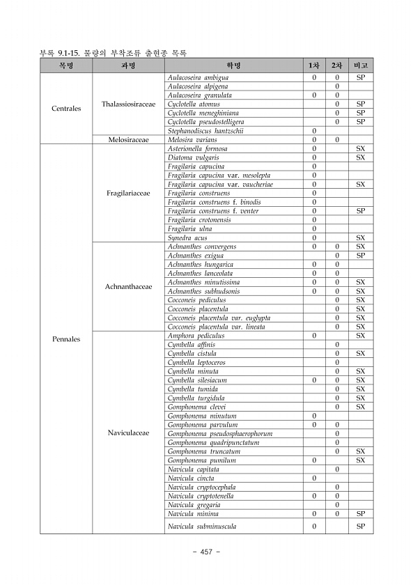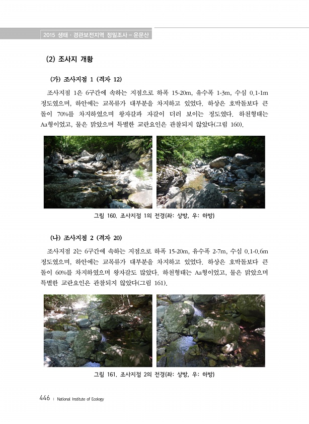 2015 생태·경관보전지역 정밀조사 운문산 446 ? National Institute of Ecology 2 조사지 개황 가 조사지점 1 격자 12 조사지점 1은 6구간에 속하는 지점으로 하폭 15-20m, 유수폭 1-3m, 수심 0.1-1m 정도였으며, 하안에는 교목류가 대부분을 차지하고 있었다. 하상은 호박돌보다 큰 돌이 70%를 차지하였으며 왕자갈과 자갈이 더러 보이는 정도였다. 하천형태는 Aa형이었고, 물은 맑았으며 특별한 교란요인은 관찰되지 않았다 그림 160 그림 160. 조사지점 1의 전경 좌상방, 우하방 나 조사지점 2 격자 20 조사지점 2는 6구간에 속하는 지점으로 하폭 15-20m, 유수폭 2-7m, 수심 0.1-0.6m 정도였으며, 하안에는 교목류가 대부분을 차지하고 있었다. 하상은 ...