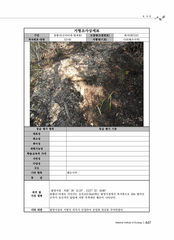 Ⅲ. 부 록 National Institute of EcologyⅠ447 지형조사상세표 구간 봉황산 신의터재-형제봉 도엽명 도엽번호 화서 367122 격자번호-연번 E2-05 지형명 기호 기타 훼손지역 등급 평가 항목 등급 평가 기준 대표성 희소성 특이성 재현가능성 학술?교육적 가치 자연성 다양성 규모 기타 항목 훼손지역 등 급 위치 및 사진 설명 촬영지점 N36° 28′ 31.23″ , E127° 55′ 18.80″ 봉황산-비재로 이어지는 등산로 2.5km 에는 촬영지점에서 북서쪽으로 10m 떨어진 곳까지 등산객의 답압에 의한 목책계단 훼손이 나타난다. 기타 의견 촬영지점과 지형의 위치가 인접하여 동일한 좌표를부여하였다.