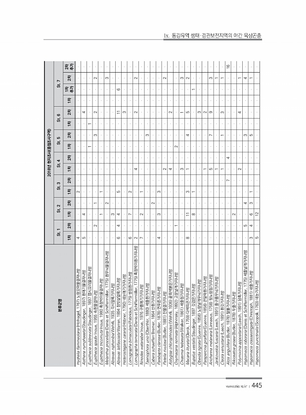 445 분류군명 2018년 현지조사 중점조사구역 St. 1 St. 2 St. 3 St. 4 St. 5 St. 6 St. 7 1차 2차 1차 2차 1차 2차 1차 2차 1차 2차 1차 2차 1차 1차 추가 2차 추가 2차 Hydrelia flammeolaria H?fnagel, 1767 노랑꼬마물결자나방 4 2 Asthena nymphaeata Staudinger, 1897 흰애기물결자나방 5 4 4 Eupithecia subbreviata Staudinger, 1897 맵시꼬리물결자나방 1 1 Eupithecia spadix Inoue, 1955 속흰물결자나방 ...