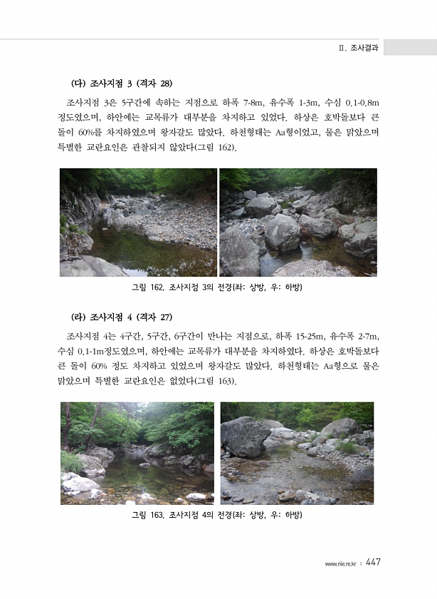 Ⅱ. 조사결과 www.nie.re.kr ? 447 다 조사지점 3 격자 28 조사지점 3은 5구간에 속하는 지점으로 하폭 7-8m, 유수폭 1-3m, 수심 0.1-0.8m 정도였으며, 하안에는 교목류가 대부분을 차지하고 있었다. 하상은 호박돌보다 큰 돌이 60%를 차지하였으며 왕자갈도 많았다. 하천형태는 Aa형이었고, 물은 맑았으며 특별한 교란요인은 관찰되지 않았다 그림 162 그림 162. 조사지점 3의 전경 좌상방, 우하방 라 조사지점 4 격자 27 조사지점 4는 4구간, 5구간, 6구간이 만나는 지점으로, 하폭 15-25m, 유수폭 2-7m, 수심 0.1-1m정도였으며, 하안에는 교목류가 대부분을 차지하였다. 하상은 호박돌보다 큰 돌이 60% 정도 차지하고 있었으며 왕자갈도 많았다. 하천형태는 Aa형으...