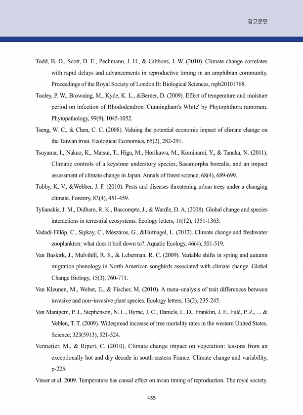 455 참고문헌 Todd, B. D., Scott, D. E., Pechmann, J. H., & Gibbons, J. W. 2010 Climate change correlates with rapid delays and advancements in reproductive timing in an amphibian community. Proceedings of the Royal Society of London BBiological Sciences, rspb20101768. Tooley, P. W., Browning, M., Kyde, K. L., &Berner, D. 2009 Effect of temperature and moisture period on infection of Rhododendron Cunni...