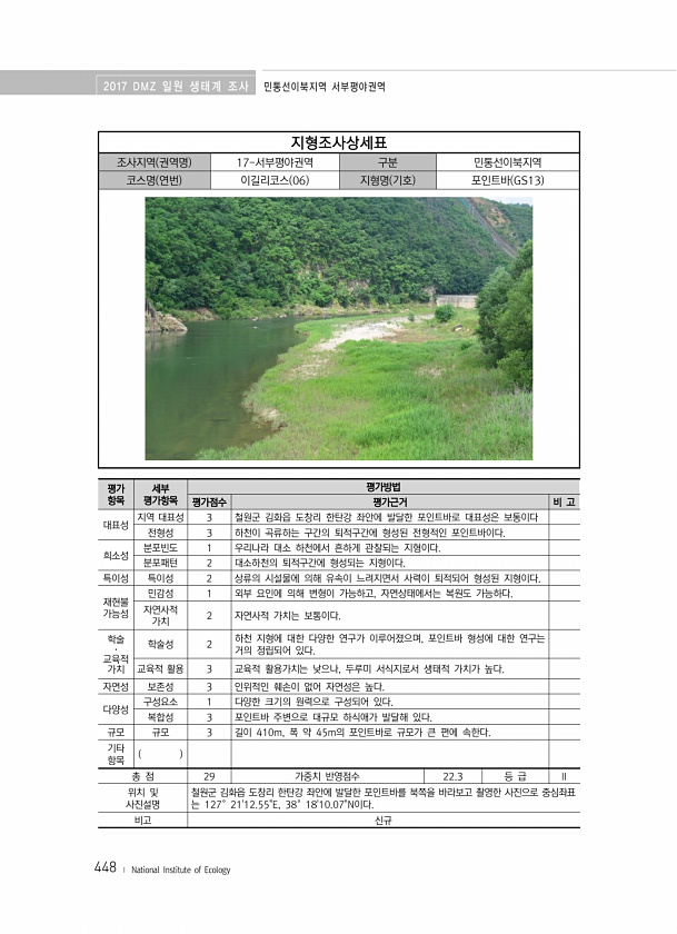 2017 DMZ 일원 생태계 조사 민통선이북지역 서부평야권역 448 ? National Institute of Ecology 지형조사상세표 조사지역 권역명 17-서부평야권역 구분 민통선이북지역 코스명 연번 이길리코스 06 지형명 기호 포인트바 GS13 평가 항목 세부 평가항목 평가방법 평가점수 평가근거 비 고 대표성 지역 대표성 3 철원군 김화읍 도창리 한탄강 좌안에 발달한 포인트바로 대표성은 보통이다 전형성 3 하천이 곡류하는 구간의 퇴적구간에 형성된 전형적인 포인트바이다. 희소성 분포빈도 1 우리나라 대소 하천에서 흔하게 관찰되는 지형이다. 분포패턴 2 대소하천의 퇴적구간에 형성되는 지형이다. 특이성 특이성 2 상류의 시설물에 의해 유속이 느려지면서 사력이 퇴적되어 형성된 지형이다. 재현불 가능성 민감성...