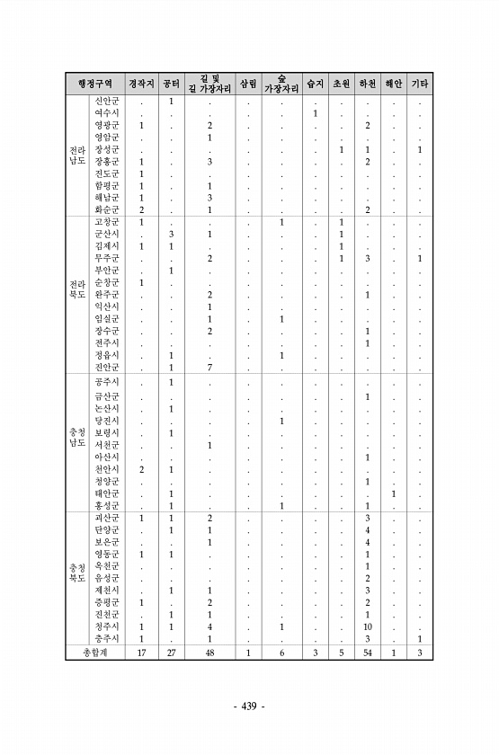439 행정구역 경작지 공터 길 및 길 가장자리 삼림 가장숲자리 습지 초원 하천 해안 기타 전라 남도 신안군 1 여수시 1 영광군 1 2 2 영암군 1 장성군 1 1 1 장흥군 1 3 2 진도군 1 함평군 1 1 해남군 1 3 화순군 2 1 2 전라 북도 고창군 1 1 1 군산시 3 1 1 김제시 1 1 1 무주군 2 1 3 1 부안군 1 순창군 1 완주군 2 1 익산시 1 임실군 1 1 장수군 2 1 전주시 1 정읍시 1 1 진안군 1 7 충청 남도 공주시 1 금산군 1 논산시 1 당진시 1 보령시 1 서천군 1 아산시 1 천안시 2 1 청양군 1 태안군 1 1 홍성군 1 1 1 충청 북도 괴산군 1 1 2 3 단양군 1 1 4 보은군 1 4 영동군 1 1 1 옥천군 1 음성군 2 제천시 1 1 3 증평군...