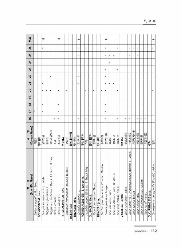 445 학 명 Scientific Name 국 명 Korean Name 16 17 18 19 20 21 22 23 24 25 26 비고 Stellaria aquatica L. Scop. 쇠별꽃 * POLYGONACEAE Juss. 마디풀과 Fallopia dumetorum L. Holub 닭의덩굴 * * * * * 귀 Polygonum persicaria L. 봄여뀌 * Polygonum senticosum Meisn. Franch. & Sav. 며느리밑씻개 * * Rumex acetosa L. 수영 * Rumex crispus L. 소리쟁이 * * * * 귀 PLUMBAGINACEAE Juss. 갯길경과 Limonium tetragonum Thunb. Bullock 갯길경 * DILLENIIDAE 딜레니아...