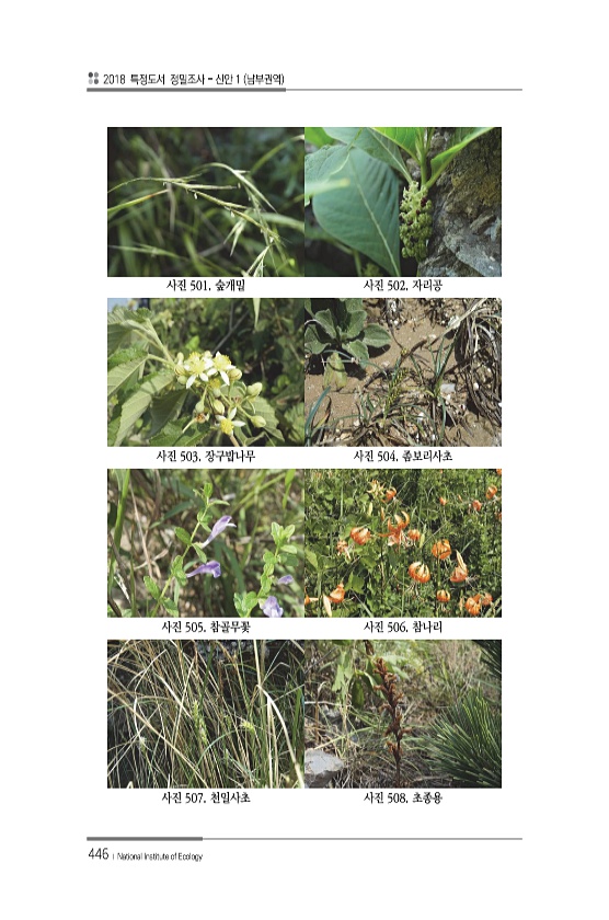 2018 특정도서 정밀조사 신안 1 남부권역 446 ? National Institute of Ecology 사진 501. 숲개밀 사진 502. 자리공 사진 503. 장구밥나무 사진 504. 좀보리사초 사진 505. 참골무꽃 사진 506. 참나리 사진 507. 천일사초 사진 508.초종용
