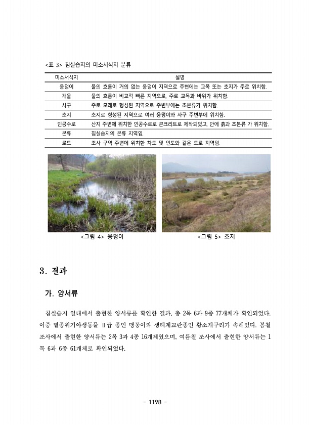 1198 미소서식지 설명 웅덩이 물의 흐름이 거의 없는 웅덩이 지역으로 주변에는 교목 또는 초지가 주로 위치함. 개울 물의 흐름이 비교적 빠른 지역으로, 주로 교목과 바위가 위치함. 사구 주로 모래로 형성된 지역으로 주변부에는 초본류가 위치함. 초지 초지로 형성된 지역으로 여러 웅덩이와 사구 주변부에 위치함. 인공수로 산지 주변에 위치한 인공수로로 콘크리트로 제작되었고, 안에 흙과 초본류 가 위치함. 본류 침실습지의 본류 지역임. 로드 조사 구역 주변에 위치한 차도 및 인도와 같은 도로 지역임. 표 3 침실습지의 미소서식지 분류 그림 4 웅덩이 그림 5 초지 3. 결과 가. 양서류 침실습지 일대에서 출현한 양서류를 확인한 결과, 총 2목 6과 9종 77개체가 확인되었다. 이중 멸종위기야생동물 Ⅱ급 종인 맹꽁...