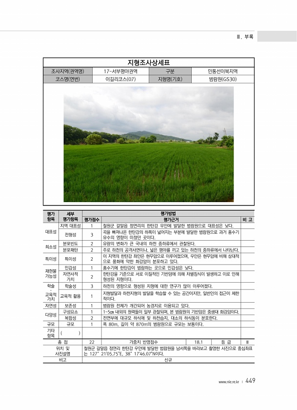 Ⅲ. 부록 www.nie.re.kr ? 449 지형조사상세표 조사지역 권역명 17-서부평야권역 구분 민통선이북지역 코스명 연번 이길리코스 07 지형명 기호 범람원 GS30 평가 항목 세부 평가항목 평가방법 평가점수 평가근거 비 고 대표성 지역 대표성 1 철원군 갈말읍 정연리의 한탄강 우안에 발달한 범람원으로 대표성은 낮다. 전형성 3 곡을 빠져나온 한탄강의 하폭이 넓어지는 부분에 발달한 범람원으로 과거 홍수기 유수의 영향이 미쳤던 곳이다. 희소성 분포빈도 2 유량의 변화가 큰 국내의 하천 중하류에서 관찰된다. 분포패턴 2 주로 하천의 공격사면이나, 넓은 평야를 끼고 있는 하천의 중하류에서 나타난다. 특이성 특이성 2 이 지역의 한탄강 좌안은 현무암으로 이루어졌으며, 우안은 현무암에 비해 상대적 으로 풍화에 ...