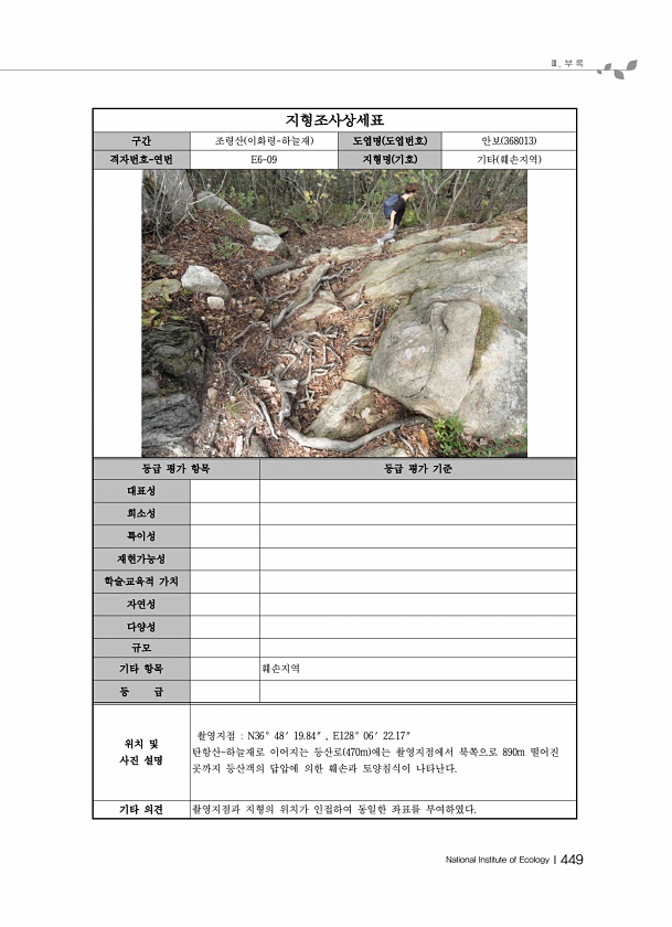 Ⅲ. 부 록 National Institute of EcologyⅠ449 지형조사상세표 구간 조령산 이화령-하늘재 도엽명 도엽번호 안보 368013 격자번호-연번 E6-09 지형명 기호 기타 훼손지역 등급 평가 항목 등급 평가 기준 대표성 희소성 특이성 재현가능성 학술?교육적 가치 자연성 다양성 규모 기타 항목 훼손지역 등 급 위치 및 사진 설명 촬영지점 N36° 48′ 19.84″ , E128° 06′ 22.17″ 탄항산하늘재로 이어지는 등산로 470m 에는 촬영지점에서 북쪽으로 890m 떨어진 곳까지 등산객의 답압에 의한 훼손과 토양침식이 나타난다. 기타 의견 촬영지점과 지형의 위치가 인접하여 동일한 좌표를부여하였다.