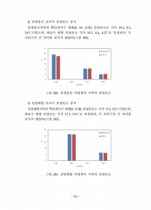 412 2 만세동산 조사지 토양온도 분석 만세동산지역의 뿌리제거구 월별 8, 10, 11월 토양온도는 각각 19.3, 8.3, 3.8℃이었으며, 대조구 월별 토양온도 각각 18.1, 8.4, 4.2℃로 측정되어, 두 처리구간 큰 차이를 보이지 않았다 그림 280 그림 280. 만세동산 비벌채지 지역의 토양온도 3 진달래밭 조사지 토양온도 분석 진달래밭지역의 뿌리제거구 월별 9, 11월 토양온도는 각각 17.2, 5.2℃이었으며, 대조구 월별 토양온도 각각 17.1, 5.0℃로 측정되어, 두 처리구간 큰 차이를 보이지 않았다 그림 281 그림 281. 진달래밭 비벌채지 지역의토양온도