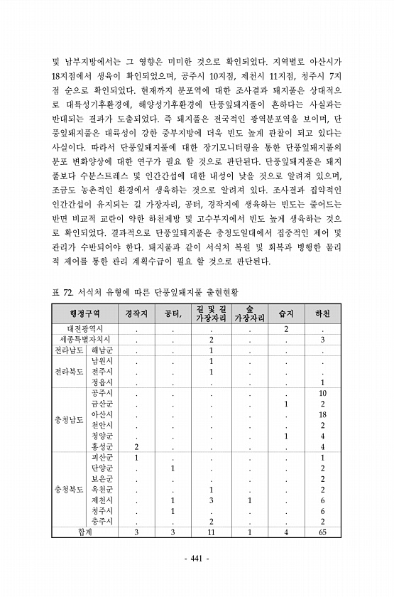 441 및 남부지방에서는 그 영향은 미미한 것으로 확인되었다. 지역별로 아산시가 18지점에서 생육이 확인되었으며, 공주시 10지점, 제천시 11지점, 청주시 7지 점 순으로 확인되었다. 현재까지 분포역에 대한 조사결과 돼지풀은 상대적으 로 대륙성기후환경에, 해양성기후환경에 단풍잎돼지풀이 흔하다는 사실과는 반대되는 결과가 도출되었다. 즉 돼지풀은 전국적인 광역분포역을 보이며, 단 풍잎돼지풀은 대륙성이 강한 중부지방에 더욱 빈도 높게 관찰이 되고 있다는 사실이다. 따라서 단풍잎돼지풀에 대한 장기모니터링을 통한 단풍잎돼지풀의 분포 변화양상에 대한 연구가 필요 할 것으로 판단된다. 단풍잎돼지풀은 돼지 풀보다 수분스트레스 및 인간간섭에 대한 내성이 낮을 것으로 알려져 있으며, 조금도 농촌적인 환경에서 생육하는 것으로...