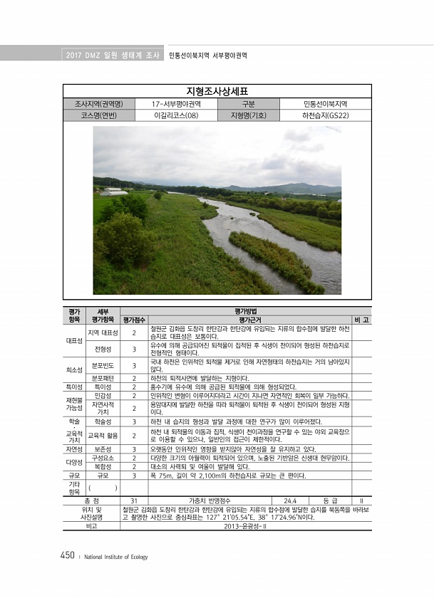 2017 DMZ 일원 생태계 조사 민통선이북지역 서부평야권역 450 ? National Institute of Ecology 지형조사상세표 조사지역 권역명 17-서부평야권역 구분 민통선이북지역 코스명 연번 이길리코스 08 지형명 기호 하천습지 GS22 평가 항목 세부 평가항목 평가방법 평가점수 평가근거 비 고 대표성 지역 대표성 2 철원군 김화읍 도창리 한탄강과 한탄강에 유입되는 지류의 합수점에 발달한 하천 습지로 대표성은 보통이다. 전형성 3 유수에 의해 공급되어진 퇴적물이 집적된 후 식생이 천이되어 형성된 하천습지로 전형적인 형태이다. 희소성 분포빈도 3 국내 하천은 인위적인 퇴적물 제거로 인해 자연형태의 하천습지는 거의 남아있지 않다. 분포패턴 2 하천의 퇴적사면에 발달하는 지형이다. 특이성 특이성 2...