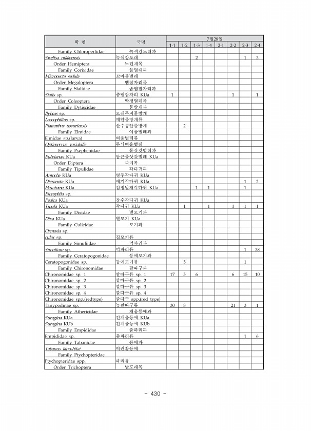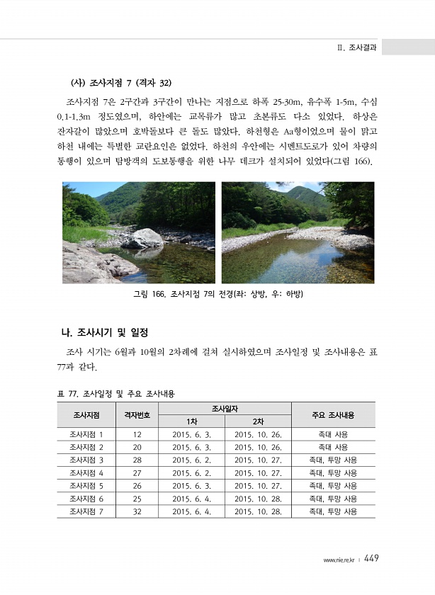 Ⅱ. 조사결과 www.nie.re.kr ? 449 사 조사지점 7 격자 32 조사지점 7은 2구간과 3구간이 만나는 지점으로 하폭 25-30m, 유수폭 1-5m, 수심 0.1-1.3m 정도였으며, 하안에는 교목류가 많고 초본류도 다소 있었다. 하상은 잔자갈이 많았으며 호박돌보다 큰 돌도 많았다. 하천형은 Aa형이었으며 물이 맑고 하천 내에는 특별한 교란요인은 없었다. 하천의 우안에는 시멘트도로가 있어 차량의 통행이 있으며 탐방객의 도보통행을 위한 나무 데크가 설치되어 있었다 그림 166 그림 166. 조사지점 7의 전경 좌상방, 우하방 나. 조사시기 및 일정 조사 시기는 6월과 10월의 2차례에 걸쳐 실시하였으며 조사일정 및 조사내용은 표 77과 같다. 조사지점 격자번호 조사일자 주요 조사내용 1차 2차 조...