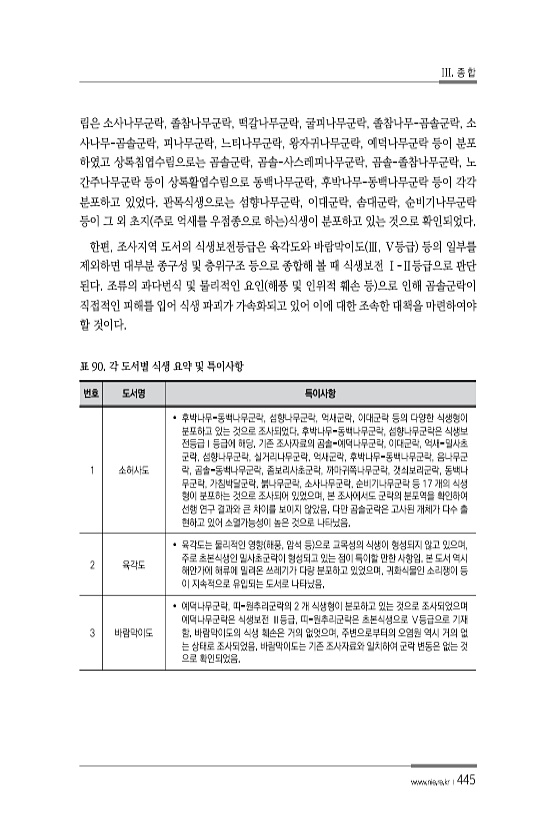 III. 종 합 www.nie.re.kr ?445 림은 소사나무군락, 졸참나무군락, 떡갈나무군락, 굴피나무군락, 졸참나무-곰솔군락, 소 사나무-곰솔군락, 피나무군락, 느티나무군락, 왕자귀나무군락, 예덕나무군락 등이 분포 하였고 상록침엽수림으로는 곰솔군락, 곰솔-사스레피나무군락, 곰솔-졸참나무군락, 노 간주나무군락 등이 상록활엽수림으로 동백나무군락, 후박나무-동백나무군락 등이 각각 분포하고 있었다. 관목식생으로는 섬향나무군락, 이대군락, 솜대군락, 순비기나무군락 등이 그 외 초지 주로 억새를 우점종으로 하는 식생이 분포하고 있는 것으로 확인되었다. 한편, 조사지역 도서의 식생보전등급은 육각도와 바람막이도 Ⅲ, Ⅴ등급 등의 일부를 제외하면 대부분 종구성 및 층위구조 등으로 종합해 볼 때 식생보전 Ⅰ-Ⅱ등급으로 ...