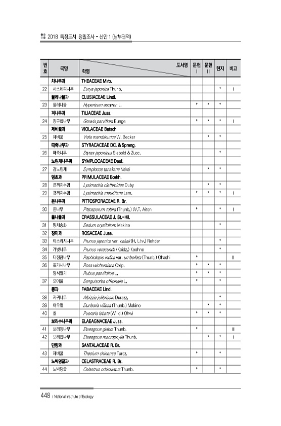 2018 특정도서 정밀조사 신안 1 남부권역 448 ? National Institute of Ecology 번 호 국명 도서명 학명 문헌 Ⅰ 문헌 Ⅱ 현지 비고 차나무과 THEACEAE Mirb. 22 사스레피나무 Eurya japonica Thunb. * Ⅰ 물레나물과 CLUSIACEAE Lindl. 23 물레나물 Hypericum ascyron L. * * * 피나무과 TILIACEAE Juss. 24 장구밥나무 Grewia parviflora Bunge * * * Ⅰ 제비꽃과 VIOLACEAE Batsch 25 제비꽃 Viola mandshurica W. Becker * * 때죽나무과 STYRACACEAE DC. & Spreng. 26 때죽나무 Styrax japonicus Siebold & Zucc...