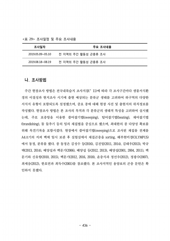 436 조사일자 주요 조사내용 2019.05.0905.10 전 지역의 주간 활동성 곤충류 조사 2019.08.1808.19 전 지역의 주간 활동성 곤충류 조사 표 29 조사일정 및 주요 조사내용 주간 현장조사 방법은 전국내륙습지 조사지침 에 따라 각 조사구간마다 생물서식환 ’11 경의 이질성과 현지조사 시기에 출현 예상되는 분류군 생태를 고려하여 하구역의 다양한 서식지 유형이 포함되도록 설정했으며 중요 종에 대해 현장 사진 및 출현지의 위치정보를 , 작성했다 현장조사 방법은 본 조사의 목적과 각 분류군의 생태적 특성을 고려하여 실시했 는데 주로 포충망을 이용한 쓸어잡기법 , sweeping , 털어잡기법 채어잡기법 beating , brandishing , 돌 들추기 등의 임의 채집법을 중심으로 했으며 최대...