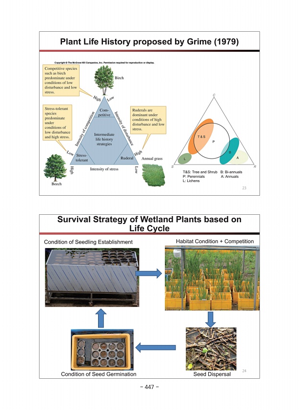 Survival Strategy of Wetland Plants based on Life Cycle Condition of Seedling Establishment Habitat Condition + Competition Condition of Seed Germination Seed Dispersal 24 Plant Life History proposed by Grime 1979 T&STree and Shrub BBi-annuals PPerennials AAnnuals LLichens 23 447