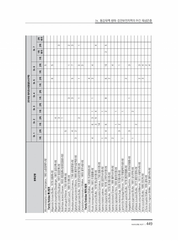 449 분류군명 2018년 현지조사 중점조사구역 St. 1 St. 2 St. 3 St. 4 St. 5 St. 6 St. 7 1차 2차 1차 2차 1차 2차 1차 2차 1차 2차 1차 2차 1차 1차 추가 2차 추가 2차 Micromelalopha vicina Tshistjakov, 1963 노랑점재주나방 5 Family Nolidae 혹나방과 Meganola fumosa Butler, 1879 쌍줄혹나방 6 5 Meganola bryophilalis Staudinger, 1887 깊은산혹나방 4 Meganola costalis Staudinger, 18...