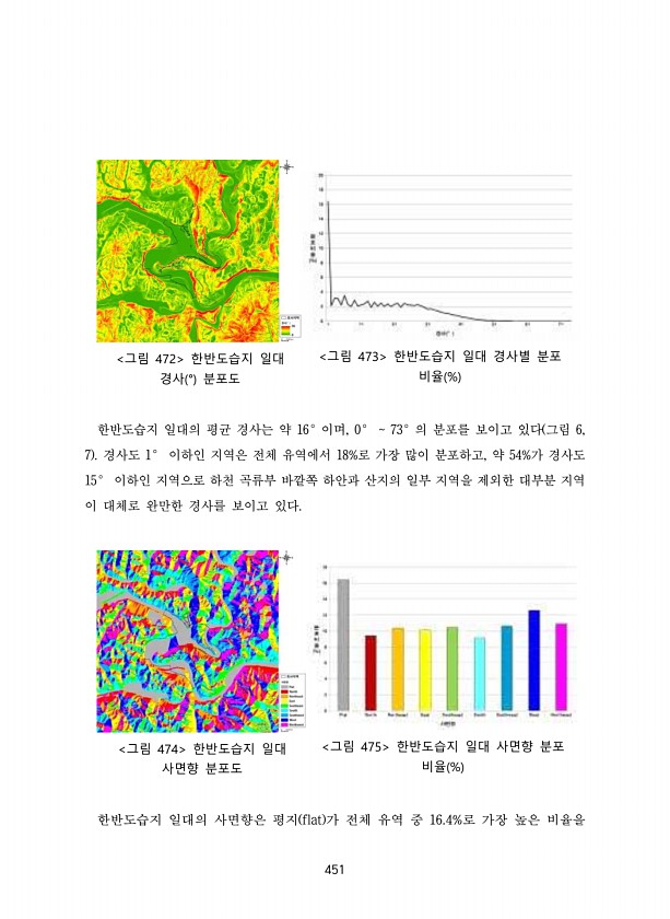 451 그림 472 한반도습지 일대 경사 ° 분포도 그림 473 한반도습지 일대 경사별 분포 비율 % 한반도습지 일대의 평균 경사는 약 16°이며, 0° 73°의 분포를 보이고 있다 그림 6, 7 경사도 1° 이하인 지역은 전체 유역에서 18%로 가장 많이 분포하고, 약 54%가 경사도 15° 이하인 지역으로 하천 곡류부 바깥쪽 하안과 산지의 일부 지역을 제외한 대부분 지역 이 대체로 완만한 경사를 보이고 있다. 그림 474 한반도습지 일대 사면향 분포도 그림 475 한반도습지 일대 사면향 분포 비율 % 한반도습지 일대의 사면향은 평지 flat 가 전체 유역 중 16.4%로 가장 높은비율을