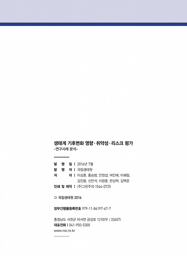 생태계 기후변화 영향·취약성·리스크 평가 -연구사례 분석- □ 국립생태원 2016 정부간행물등록번호 979-11-86197-67-7 충청남도 서천군 마서면 금강로 1210 우 | 33657 대표전화 | 041-950-5300 www.nie.re.kr 발 행 일 발 행 처 저 자 인쇄 및 제작 2016년 7월 국립생태원 이상훈, 홍승범, 안정섭, 여인애, 이혜림, 김진용, 신만석, 이창훈, 한상학, 김백준 주 그린주의 1544-0725 | | ||
