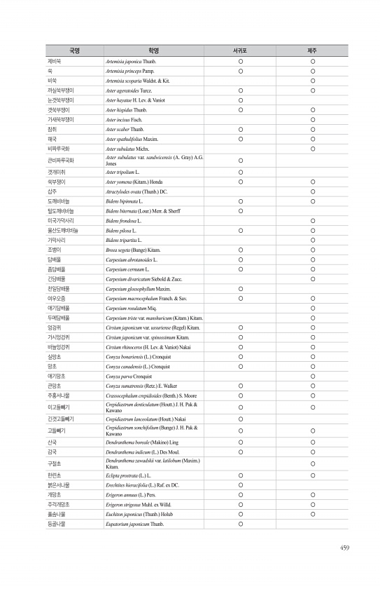 459 제비쑥 Artemisia japonica Thunb. ○ ○ 쑥 Artemisia princeps Pamp. ○ ○ 비쑥 Artemisia scoparia Waldst. & Kit. ○ 까실쑥부쟁이 Aster ageratoides Turcz. ○ ○ 눈갯쑥부쟁이 Aster hayatae H. Lev. & Vaniot ○ 갯쑥부쟁이 Aster hispidus Thunb. ○ ○ 가새쑥부쟁이 Aster incisus Fisch. ○ 참취 Aster scaber Thunb. ○ ○ 해국 Aster spathulifolius Maxim. ○ ○ 비짜루국화 Aster subulatus Michx. ○ 큰비짜루국화 Aster subulatus var. sandwicensis A. Gray A.G. Jones ○...