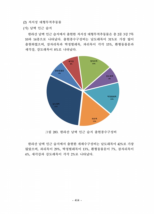 414 2 저서성 대형무척추동물 가 남벽 인근 습지 한라산 남벽 인근 습지에서 출현한 저서성 대형무척추동물은 총 2문 3강 7목 10과 14종으로 나타났다. 출현종수구성비는 날도래목이 31%로 가장 많이 출현하였으며, 잠자리목과 딱정벌레목, 파리목이 각각 15%, 환형동물문과 새각강, 강도래목이 8%로 나타났다. 그림 283. 한라산 남벽 인근 습지 출현종수구성비 한라산 남벽 인근 습지에서 출현한 개체수구성비는 날도래목이 42%로 가장 많았으며, 파리목이 29%, 딱정벌레목이 13%, 환형동물문이 7%, 잠자리목이 4%, 새각강과 강도래목이 각각 2%로나타났다.