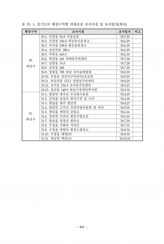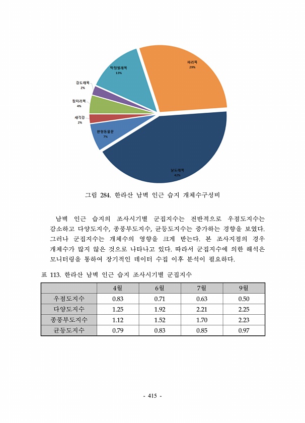 415 그림 284. 한라산 남벽 인근 습지 개체수구성비 남벽 인근 습지의 조사시기별 군집지수는 전반적으로 우점도지수는 감소하고 다양도지수, 종풍부도지수, 균등도지수는 증가하는 경향을 보였다. 그러나 군집지수는 개체수의 영향을 크게 받는다. 본 조사지점의 경우 개체수가 많지 않은 것으로 나타나고 있다. 따라서 군집지수에 의한 해석은 모니터링을 통하여 장기적인 데이터 수집 이후 분석이 필요하다. 4월 6월 7월 9월 우점도지수 0.83 0.71 0.63 0.50 다양도지수 1.25 1.92 2.21 2.25 종풍부도지수 1.12 1.52 1.70 2.23 균등도지수 0.79 0.83 0.85 0.97 표 113. 한라산 남벽 인근 습지 조사시기별군집지수