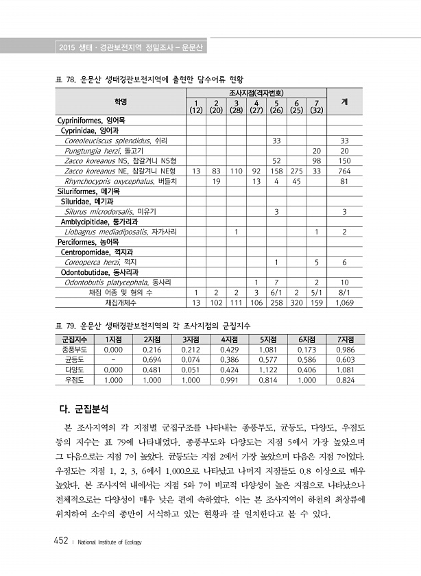 2015 생태·경관보전지역 정밀조사 운문산 452 ? National Institute of Ecology 표 78. 운문산 생태경관보전지역에 출현한 담수어류 현황 학명 조사지점 격자번호 1 계 12 2 20 3 28 4 27 5 26 6 25 7 32 Cypriniformes, 잉어목 Cyprinidae, 잉어과 Coreoleuciscus splendidus, 쉬리 33 33 Pungtungia herzi, 돌고기 20 20 Zacco koreanus NS, 참갈겨니 NS형 52 98 150 Zacco koreanus NE, 참갈겨니 NE형 13 83 110 92 158 275 33 764 Rhynchocypris oxycephalus, 버들치 19 13 4 45 81 Siluriformes, 메기목 Si...