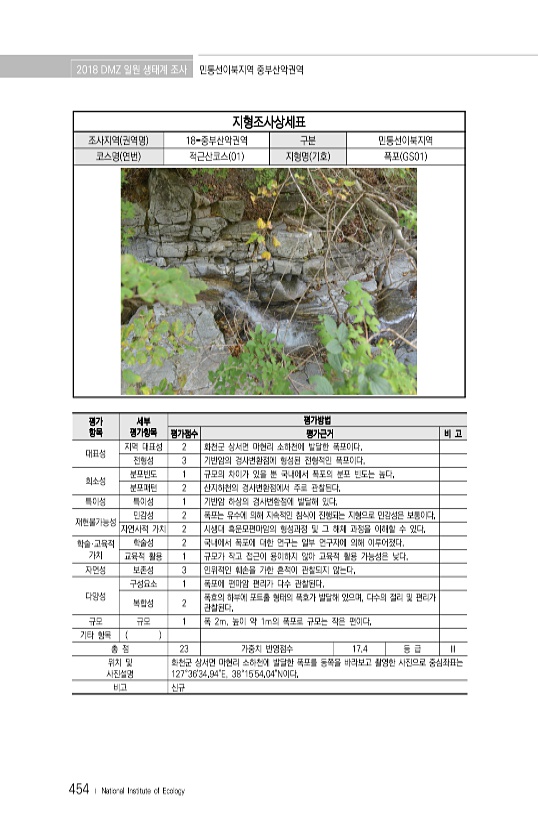 2018 DMZ 일원 생태계 조사 민통선이북지역 중부산악권역 454 ? National Institute of Ecology 지형조사상세표 조사지역 권역명 18-중부산악권역 구분 민통선이북지역 코스명 연번 적근산코스 01 지형명 기호 폭포 GS01 평가 항목 세부 평가항목 평가방법 평가점수 평가근거 비 고 대표성 지역 대표성 2 화천군 상서면 마현리 소하천에 발달한 폭포이다. 전형성 3 기반암의 경사변환점에 형성된 전형적인 폭포이다. 희소성 분포빈도 1 규모의 차이가 있을 뿐 국내에서 폭포의 분포 빈도는 높다. 분포패턴 2 산지하천의 경사변환점에서 주로 관찰된다. 특이성 특이성 1 기반암 하상의 경사변환점에 발달해 있다. 재현불가능성 민감성 2 폭포는 유수에 의해 지속적인 침식이 진행되는 지형으로 민감성은 ...