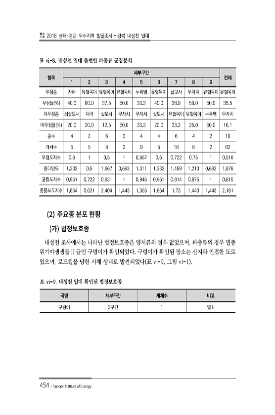 2018 생태·경관 우수지역 발굴조사 경북 내성천 일대 454 ? National Institute of Ecology 항목 세부구간 전체 1 2 3 4 5 6 7 8 9 우점종 자라 유혈목이 유혈목이 유혈목이 누룩뱀 유혈목이 살모사 무자치 유혈목이 유혈목이 우점율 % 40.0 80.0 37.5 50.0 33.3 40.0 38.9 50.0 50.0 35.5 아우점종 쇠살모사 자라 살모사 무자치 무자치 살모사 유혈목이 유혈목이 누룩뱀 무자치 아우점율 % 20.0 20.0 12.5 50.0 33.3 20.0 33.3 25.0 50.0 16.1 종수 4 2 6 2 4 4 6 4 2 10 개체수 5 5 8 2 9 5 18 8 2 62 우점도지수 0.6 1 0.5 1 0.667 0.6 0.722 0.75 1 0.51...