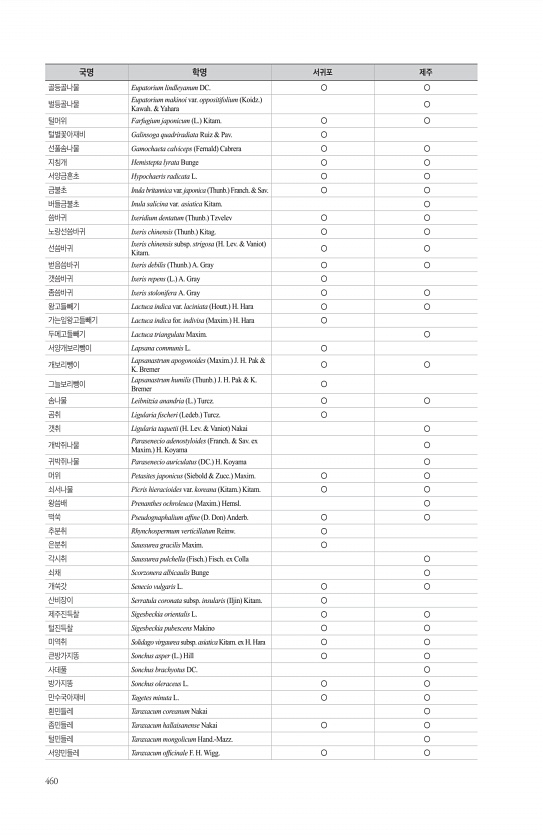 460 골등골나물 Eupatorium lindleyanum DC. ○ ○ 벌등골나물 Eupatorium makinoi var. oppositifolium Koidz. Kawah. & Yahara ○ 털머위 Farfugium japonicum L. Kitam. ○ ○ 털별꽃아재비 Galinsoga quadriradiata Ruiz & Pav. ○ 선풀솜나물 Gamochaeta calviceps Fernald Cabrera ○ ○ 지칭개 Hemistepta lyrata Bunge ○ ○ 서양금혼초 Hypochaeris radicata L. ○ ○ 금불초 Inula britannica var. japonica Thunb. Franch. & Sav. ○ ○ 버들금불초 Inula salicina var. asiati...