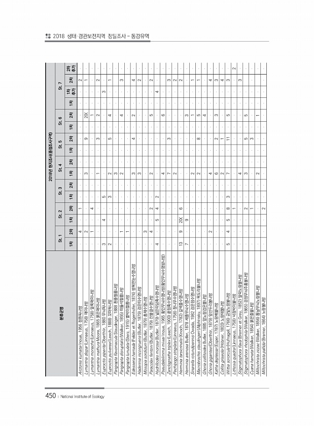 450 분류군명 2018년 현지조사 중점조사구역 St. 1 St. 2 St. 3 St. 4 St. 5 St. 6 St. 7 1차 2차 1차 2차 1차 2차 1차 2차 1차 2차 1차 2차 1차 1차 추가 2차 추가 2차 Arctonis kumatai Inoue, 1956 점흰독나방 4 1 2 Lymantria dispar Linnaeus, 1758 매미나방 2 3 9 20 1 Lymantria monacha Linnaeus, 1758 얼룩매미나방 1 4 1 Lymantria mathura Moore, 1865 붉은매미나방 1 3 2 2 ...