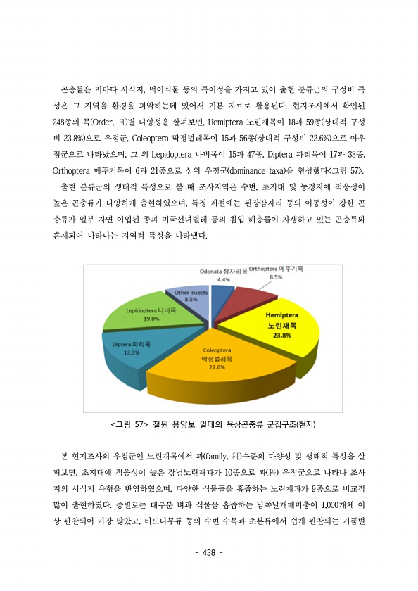 438 곤충들은 저마다 서식지 먹이식물 등의 특이성을 가지고 있어 출현 분류군의 구성비 특 , 성은 그 지역을 환경을 파악하는데 있어서 기본 자료로 활용된다 현지조사에서 확인된 248 Order, 종의 목 별 다양성을 살펴보면 目 , Hemiptera 노린재목이 과 종 상대적 구성 18 59 비 으로 우점군 23.8% , Coleoptera 딱정벌레목이 과 종 상대적 구성비 으로 아우 15 56 22.6% 점군으로 나타났으며 그 외 , Lepidoptera 15 47 , Diptera 17 33 , 나비목이 과 종 파리목이 과 종 Orthoptera 메뚜기목이 과 종으로 상위 우점군 6 21 dominance taxa 을 형성했다 그림 57 출현 분류군의 생태적 특성으로 볼 때 조사지역은 수변 초지대 및 농...