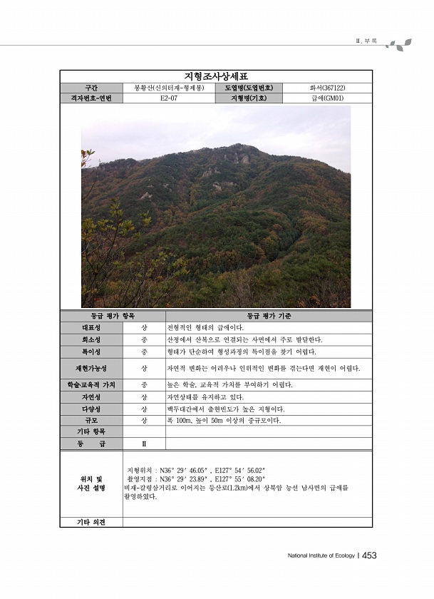 Ⅲ. 부 록 National Institute of EcologyⅠ453 지형조사상세표 구간 봉황산 신의터재-형제봉 도엽명 도엽번호 화서 367122 격자번호-연번 E2-07 지형명 기호 급애 GM01 등급 평가 항목 등급 평가 기준 대표성 상 전형적인 형태의 급애이다. 희소성 중 산정에서 산복으로 연결되는 사면에서 주로 발달한다. 특이성 중 형태가 단순하여 형성과정의 특이점을 찾기 어렵다. 재현가능성 상 자연적 변화는 어려우나 인위적인 변화를 겪는다면 재현이 어렵다. 학술?교육적 가치 중 높은 학술, 교육적 가치를 부여하기 어렵다. 자연성 상 자연상태를 유지하고 있다. 다양성 상 백두대간에서 출현빈도가 높은 지형이다. 규모 상 폭 100m, 높이 50m 이상의 중규모이다. 기타 항목 등 급 Ⅱ 위치 및 사...