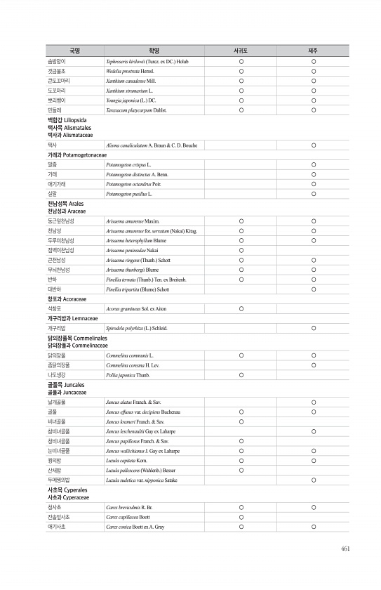 461 솜방망이 Tephroseris kirilowii Turcz. ex DC. Holub ○ ○ 갯금불초 Wedelia prostrata Hemsl. ○ ○ 큰도꼬마리 Xanthium canadense Mill. ○ ○ 도꼬마리 Xanthium strumarium L. ○ ○ 뽀리뱅이 Youngia japonica L. DC. ○ ○ 민들레 Taraxacum platycarpum Dahlst. ○ ○ 백합강 Liliopsida 택사목 Alismatales 택사과 Alismataceae 택사 Alisma canaliculatum A. Braun & C. D. Bouche ○ 가래과 Potamogetonaceae 말즘 Potamogeton crispus L. ○ 가래 Potamogeton distinctus ...