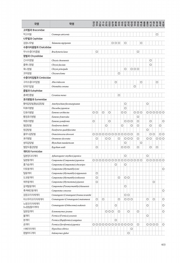 463 고치벌과 Braconidae 먹고치벌 Cremnops atricornis ○ 나무벌과 Cephidae 검정나무벌 Talamenta nigripennis ○ ○ ○ ○ ○ 수중다리좀벌과 Chalcididae 무늬수중다리좀벌 Brachymeria lasus ○ ○ 청벌과 Chrysididae 긴사치청벌 Chrysis chosenensis ○ 줄육니청벌 Chrysis fasciata ○ 육니청벌 Chrysis principalis ○ ○ ○ ○ 코마청벌 Chrysura koma ○ 수중다리잎벌과 Cimbicidae 구리수중다리잎벌 Abia iridescens ○ ○ ○ 번데기잎벌 Orientabia coreana ○ 좀벌과 Eulophidae 총채민좀벌 Ceranisus menes ○ 호리병벌과 Eumen...