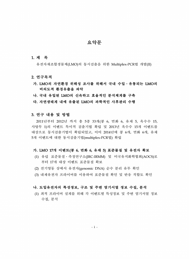 i 요약문 1. 제 목 유전자재조합생물체 LMO 의 동시검출을 위한 Multiplex-PCR법 개발 II 2. 연구목적 가. LMO의 자연환경 위해성 조사를 위해서 국내 수입?유통되는 LMO의 비의도적 환경유출을 파악 나. 국내 유입된 LMO의 신속하고 효율적인 분석체계를 구축 다. 자연생태계 내에 유출된 LMO의 과학적인 사후관리 수행 3. 연구 내용 및 방법 2011년부터 2012년 까지 총 5종 33개 콩 6, 면화 6, 유채 5, 옥수수 15, 사탕무 1 의 이벤트 특이적 검출기법 확립 및 2013년 옥수수 15개 이벤트를 대상으로 동시검출기법이 확립되었고, 이어 2014년에 콩 6개, 면화 6개, 유채 5개 이벤트에 대한 동시검출기법 multiplex-PCR법 확립 가. LMO 17개 이벤트 콩 6...