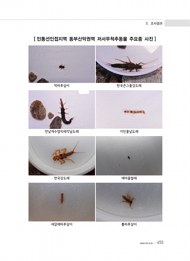 Ⅱ. 조사결과 www.nie.re.kr ? 455 [ 민통선인접지역 동부산악권역 저서무척추동물 주요종 사진 ] 먹하루살이 한국큰그물강도래 연날개수염치레각날도래 거친물날도래 한국강도래 애여울벌레 세갈래하루살이뿔하루살이