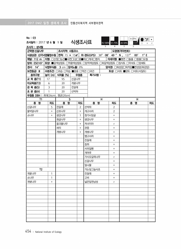 2017 DMZ 일원 생태계 조사 민통선이북지역 서부평야권역 454 ? National Institute of Ecology No 03 조사일자 2017 년 6 월 1 일 조사자 성낙필 식생조사표 군락명신갈나무 조사지역사동코스 도엽명 격자번호 식생상관산지낙엽활엽수림 면적15 × 15㎡ 위·경도 GPS 38° 08′ 49 ″ N , 127° 00′ 1″E 해발112 m 지형□산정□능선■사면□ 상□중■하 □계곡□평지 미세지형■평면 □돌출 □함몰□요철 방위ESE107 토양■갈색삼림토 □적황색삼림토 □암적색삼림토 □회갈색삼림토 □침식토 □미숙토 □암쇄토 경사14° 낙엽부식층3 cm 암석노출0% 암석권□화성암□퇴적암■변성암 화강암 보전등급Ⅲ 수분조건□과습 □약습 ■중용 □약건 □과건 토성□사토 ■양토 □식토 사질토 ...