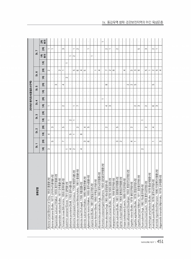 451 분류군명 2018년 현지조사 중점조사구역 St. 1 St. 2 St. 3 St. 4 St. 5 St. 6 St. 7 1차 2차 1차 2차 1차 2차 1차 2차 1차 2차 1차 2차 1차 1차 추가 2차 추가 2차 Barsine striata Bremer et Grey, 1853 홍줄불나방 3 4 1 1 2 1 Barsine aberrans Butler, 1877 교차무늬주홍테불나방 5 3 1 Rhyparioides subvaius Walker, 1855 좀안주홍불나방 3 Rhyparioides nebulosa Butler, 1877 안주홍불나방 ...
