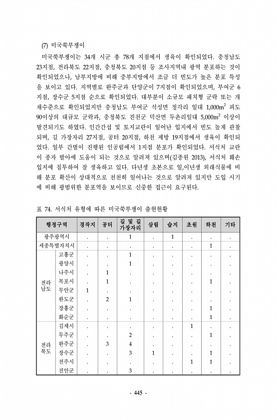 445 행정구역 경작지 공터 길 및 길 가장자리 삼림 습지 초원 하천 기타 광주광역시 1 1 세종특별자치시 1 전라 남도 고흥군 1 광양시 1 나주시 1 목포시 1 1 무안군 1 완도군 2 1 장흥군 1 화순군 1 전라 북도 김제시 1 무주군 2 1 완주군 3 4 장수군 3 1 1 전주시 1 1 진안군 3 표 74. 서식처 유형에 따른 미국쑥부쟁이 출현현황 7 미국쑥부쟁이 미국쑥부쟁이는 34개 시군 총 78개 지점에서 생육이 확인되었다. 충청남도 23지점, 전라북도 22지점, 충청북도 20지점 등 조사지역내 광역 분포하는 것이 확인되었으나, 남부지방에 비해 중부지방에서 조금 더 빈도가 높은 분포 특성 을 보이고 있다. 지역별로 완주군과 단양군이 7지점이 확인되었으며, 부여군 6 지점, 장수군 5지점 순으로 ...