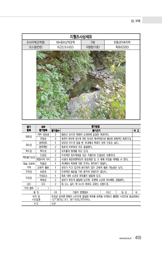 Ⅲ. 부록 www.nie.re.kr ? 455 지형조사상세표 조사지역 권역명 18-중부산악권역 구분 민통선이북지역 코스명 연번 적근산코스 02 지형명 기호 폭호 GS02 평가 항목 세부 평가항목 평가방법 평가점수 평가근거 비 고 대표성 지역 대표성 2 화천군 상서면 마현리 소하천에 발달한 폭호이다. 전형성 3 폭포의 하부에 유수에 의한 침식과 마식작용으로 형성된 전형적인 폭호이다. 희소성 분포빈도 1 규모의 차이가 있을 뿐 국내에서 폭호의 분포 빈도는 높다. 분포패턴 2 폭호의 하부에서 주로 발달한다. 특이성 특이성 2 포트홀의 형태를 띠고 있다. 재현불가능성 민감성 2 지속적인 침식작용을 받는 지형으로 민감성은 보통이다. 자연사적 가치 2 시생대 흑운모편마암의 형성과정 및 그 해체 과정을 이해할 수 있다....