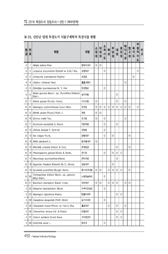 2018 특정도서 정밀조사 신안 1 북부권역 450 ? National Institute of Ecology 등 급 번 호 학명 국명 소 정 섬 대 정 섬 소 허 사 도 매 섬 부 남 섬 대 섬 호 감 섬 밖 다 리 섬 법 고 섬 육 각 도 바 람 막 이 도 비 고 Ⅴ 1 Albizia kalkora Prain 왕자귀나무 O O Ⅴ 2 Juniperus procumbens Siebold ex Endl. Miq. 섬향나무 O O Ⅴ 3 Orobanche coerulescens Stephan 초종용 O Ⅳ 4 Cladium chinense Nees 층층고랭이 O Ⅳ 5 Elsholtzia byeonsanensis M. Y. Kim 변산향유 O Ⅳ 6 Mosla japonica Maxim. var. thymoli...