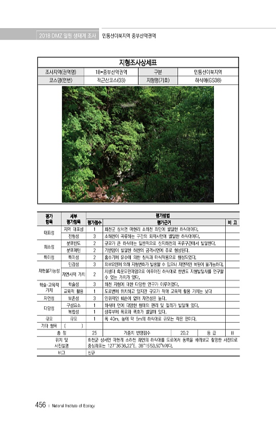 2018 DMZ 일원 생태계 조사 민통선이북지역 중부산악권역 456 ? National Institute of Ecology 지형조사상세표 조사지역 권역명 18-중부산악권역 구분 민통선이북지역 코스명 연번 적근산코스 03 지형명 기호 하식애 GS08 평가 항목 세부 평가항목 평가방법 평가점수 평가근거 비 고 대표성 지역 대표성 1 화천군 상서면 마현리 소하천 좌안에 발달한 하식애이다. 전형성 3 소하천이 곡류하는 구간의 퇴적사면에 발달한 하식애이다. 희소성 분포빈도 2 규모가 큰 하식애는 일반적으로 산지하천의 곡류구간에서 발달한다. 분포패턴 2 기반암이 발달한 하천의 공격사면에 주로 형성된다. 특이성 특이성 2 홍수기에 유수에 의한 침식과 마식작용으로 형성되었다. 재현불가능성 민감성 3 외부요인에 의해 지형...