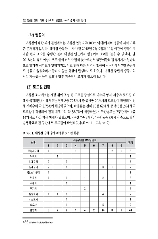 2018 생태·경관 우수지역 발굴조사 경북 내성천 일대 456 ? National Institute of Ecology 내성천에 대한 과거 문헌에서는 내성천 인접지역 100m 이내 에서의 맹꽁이 서식 기록 은 존재하지 않았다. 장마철 충분한 비가 내린 2018년 7월 9일과 10일 야간에 맹꽁이에 대한 현지 조사를 수행한 결과 내성천 인근에서 맹꽁이의 소리를 들을 수 없었다. 단 2018년의 경우 이상기후로 인해 더위가 빨리 찾아오면서 맹꽁이들의 발생시기가 일반적 으로 알려진 시기보다 앞당겨지고 이로 인해 다른 지역의 맹꽁이 서식지에서 7월 중순에 도 맹꽁이 울음소리가 들리지 않는 현상이 발생하기도 하였다. 내성천 주변에 맹꽁이의 서식 가능성은 높지 않으나 향후 지속적인 조사가 필요해 보인다. 3 내성천 조...
